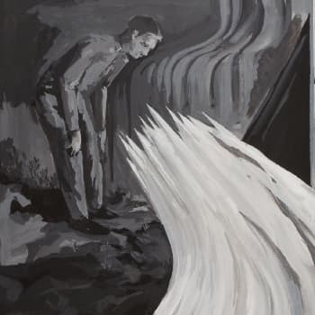 • Untitled (Man, half buried in split Composition) - Acrylic on Paper - 27" x 21"}